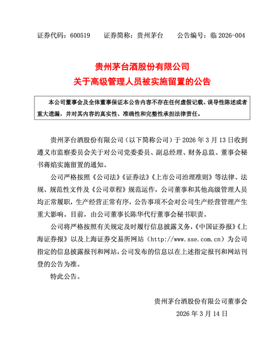 同日,贵州茅台发布公告称,公司于当日收到遵义市监察委员会关于对公司党委委员、副总经理、财务总监、董事会秘书蒋焰实施留置的通知。